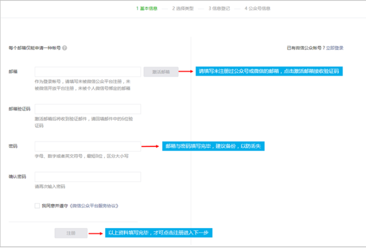 微信公眾號(hào)注冊(cè)規(guī)則多變,此處為現(xiàn)在注冊(cè)大體流程。僅供參考,實(shí)際以注冊(cè)時(shí)操作為準(zhǔn)!!